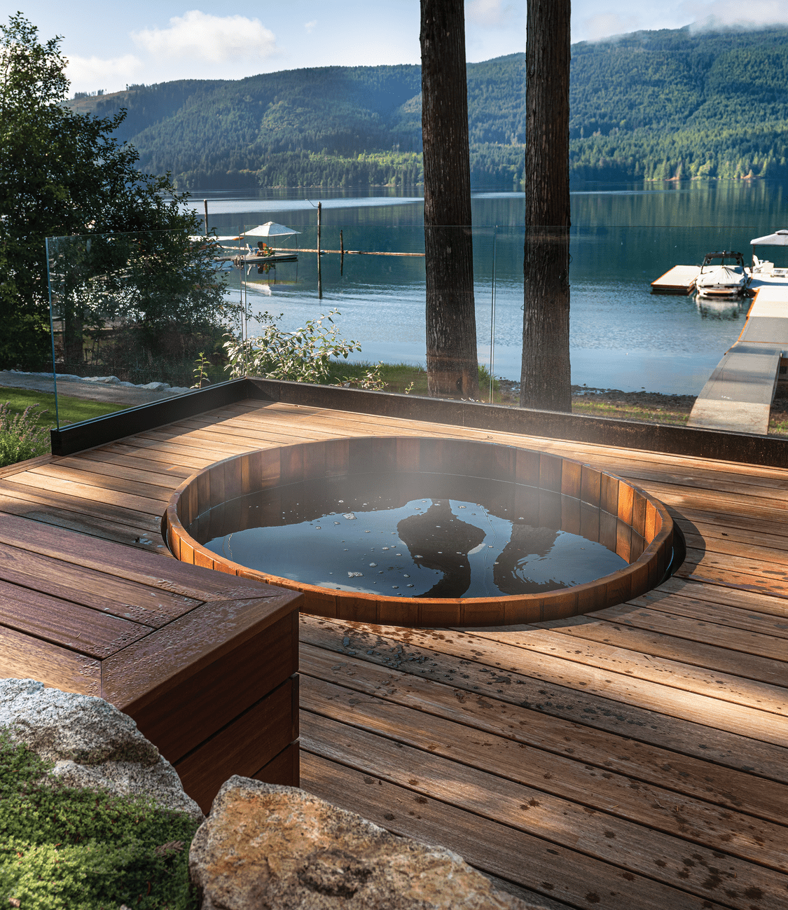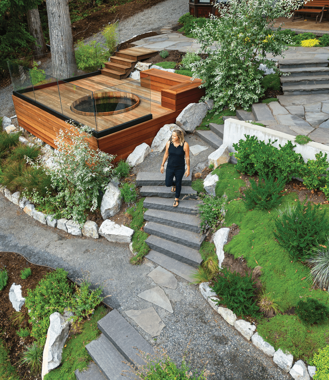 Bodley’s ecosystem-first approach extends to every surface: natural stone staircases, gravel pathways with a porous binding agent, careful siting of features like the hot tub, and avoiding concrete altogether. Each choice prevents runoff that could affect the lake’s turbidity.