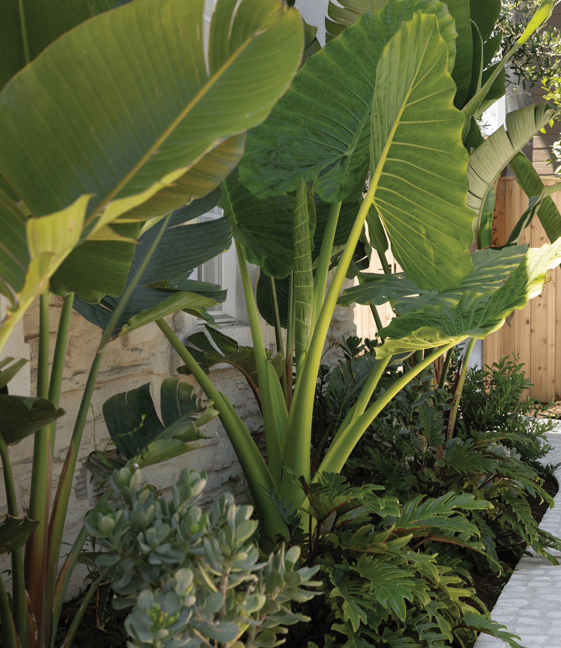 The natural environment combines an arid plant palette with bold, broadleaf tropicals; olive trees and shrubs, lavender, Pittosporum, Senecio serpens, Senecio decaryi, and Crassula ‘Blue Bird’ meet Strelitzia nicolai, giant elephant ears, and triangle palm.